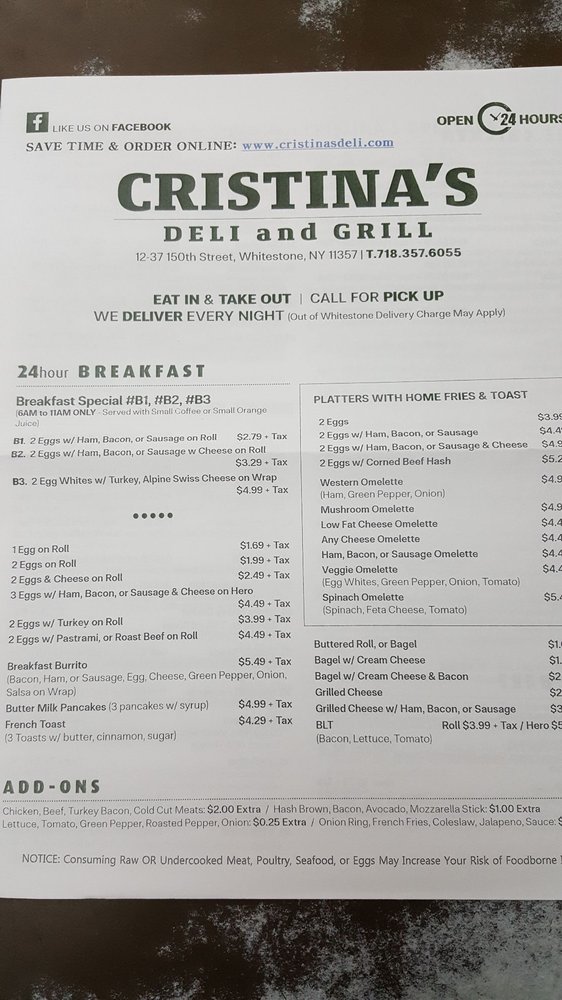 Welcome to Cristina's Deli & Grill, where you'll discover a delightful array of flavors that celebrate the essence of classic deli fare. Nestled in Whitestone, NY, this charming eatery serves up mouthwatering sandwiches and grill specialties that are sure to satisfy any craving—whether it’s breakfast, lunch, dinner, or a late-night snack.